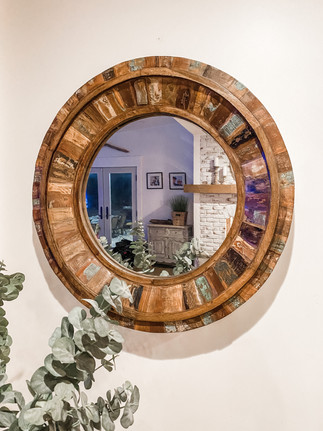 The last thing I added to the room, to really add a wow factor when you walked in, was this Jeremiah Round Wall Mirror. I went out of my comfort zone a little bit because I normally would not have been attracted to the colors that are in it, but they're subtle enough to where they don't stand out and they make a really interesting conversation piece while adding a little something to this otherwise all neutral space. It was another piece that, the second I saw it, I had to have it. To reiterate this design tip; always think about adding something round to angular spaces for contrast and balance. I use to have a large rectangular canvas in this space that I thought was great but it was too redundant with the jut out we have from the built ins. Now, this mirror draws your eye and then it circulates around the space. So important when designing a room [or a work of art].